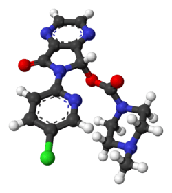 Eszopiclone is rapidly absorbed after oral administration, with serum levels peaking between .45 and 1.3 hours.[27][6] The elimination half-life of eszopiclone is approximately 6 hours and it is extensively metabolized by oxidation and demethylation. Approximately 52% to 59% of a dose is weakly bound to plasma protein. Cytochrome P450 (CYP) isozymes CYP3A4 and CYP2E1 are involved in the biotransformation of eszopiclone; thus, drugs that induce or inhibit these CYP isozymes may affect the metabolism of eszopiclone. Less than 10% of the orally administered dose is excreted in the urine as racemic zopiclone.[28][29] In terms of benzodiazepine receptor binding and relevant potency, 3 mg of eszopiclone is equivalent to 10 mg of diazepam.[30]