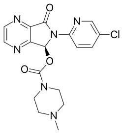Common side effects include headache, dry mouth, nausea, and dizziness.[4] Severe side effects may include suicidal thoughts, hallucinations, and angioedema.[4] Rapid decreasing of the dose may result in withdrawal.[4] Eszopiclone is classified as a nonbenzodiazepine or Z-drug and a sedative and hypnotic of the cyclopyrrolone group.[6] It is the S-stereoisomer of zopiclone.[4][7]