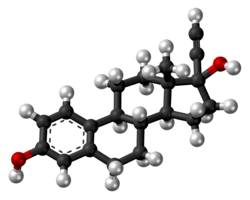 Ethinylestradiol (EE) is an estrogen medication which is used widely in birth control pills in combination with progestins.[7][8] Ethinylestradiol is widely used for various indications such as the treatment of menopausal symptoms, gynecological disorders, and certain hormone-sensitive cancers. It is usually taken by mouth but is also used as a patch and vaginal ring.[7][12]