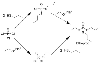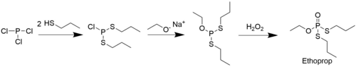 Ethoprop can be synthesised by reacting phosphoryl chloride with two equivalents of n-propylmercaptan and one equivalent of sodium ethoxide. A second pathway is reacting n-propylmercaptan and sodium ethoxide with phosphorus trichloride to yield ethoxy-bis(propylsulfanyl)phosphane, which can then be oxidized by hydrogen peroxide to yield the product.[4]
