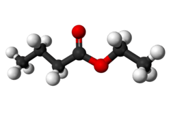 Ethyl butyrate, also known as ethyl butanoate, or butyric ether, is an ester with the chemical formula CH3CH2CH2COOCH2CH3. It is soluble in propylene glycol, paraffin oil, and kerosene. It has a fruity odor, similar to pineapple, and is a key ingredient used as a flavor enhancer in processed orange juices.[1] It also occurs naturally in many fruits, albeit at lower concentrations.[2]
