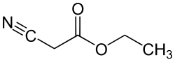 Ethyl cyanoacetate is an organic compound that contains a carboxylate ester and a nitrile. It is a colourless[1] liquid with a pleasant odor. This material is useful as a starting material for synthesis due to its variety of functional groups and chemical reactivity.[2]