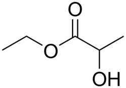 Ethyl lactate, also known as lactic acid ethyl ester, is the organic compound with the formula CH3CH(OH)CO2CH2CH3. It is the ethyl ester of lactic acid. A colorless liquid, it is a chiral ester. Being naturally derived, it is readily available as a single enantiomer. It is commonly used as a solvent.[4] This compound is considered biodegradable and can be used as a water-rinsible degreaser. Ethyl lactate is found naturally in small quantities in a wide variety of foods including wine, chicken, and various fruits. The odor of ethyl lactate when dilute is mild, buttery, creamy, with hints of fruit and coconut.[5]