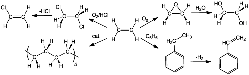 Major intermediates from the halogenation and hydrohalogenation of ethylene include ethylene dichloride, ethyl chloride, and ethylene dibromide. The addition of chlorine entails "oxychlorination", i.e. chlorine itself is not used. Some products derived from this group are polyvinyl chloride, trichloroethylene, perchloroethylene, methyl chloroform, polyvinylidene chloride and copolymers, and ethyl bromide.[16]