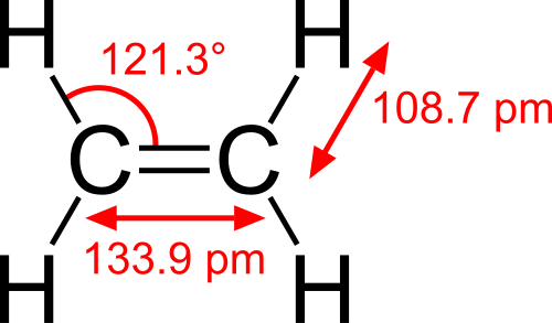 This hydrocarbon has four hydrogen atoms bound to a pair of carbon atoms that are connected by a double bond. All six atoms that comprise ethylene are coplanar. The H-C-H angle is 117.4°, close to the 120° for ideal sp² hybridized carbon. The molecule is also relatively weak: rotation about the C-C bond is a very low energy process that requires breaking the π-bond by supplying heat at 50 °C.