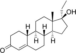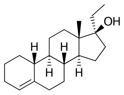 Side effects of ethylestrenol include symptoms of masculinization like acne, increased hair growth, voice changes, and increased sexual desire.[2] It can also cause liver damage.[2] The drug is a synthetic androgen and anabolic steroid and hence is an agonist of the androgen receptor (AR), the biological target of androgens like testosterone and dihydrotestosterone (DHT).[2][4] It has strong anabolic effects relative to its androgenic effects.[2] The drug also has strong progestogenic effects.[2] Ethylestrenol is a prodrug of norethandrolone.[2]