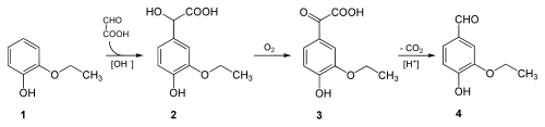 Ethylvanillin is prepared from catechol, beginning with ethylation to give guaethol (1). This ether condenses with glyoxylic acid to give the corresponding mandelic acid derivative (2), which by oxidation (3) and decarboxylation, gives ethylvanillin (4).[1]