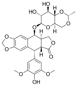 Etoposide is a semisynthetic derivative of podophyllotoxin from the rhizome of the mayapple (or "American mandrake", Podophyllum peltatum). More specifically, it is a glycoside of podophyllotoxin with a D-glucose derivative. It is chemically similar to the anti-cancer drug teniposide, being distinguished only by a methyl group where teniposide has a thienyl.[9] Both these compounds have been developed with the aim of creating less toxic derivatives of podophyllotoxin.[10]