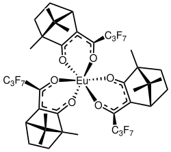 Eu(hfc)3 is the metalloorganic compound with the formula Eu(C14F7O2)3. It is a structural analogue of Eufod but contains three heptafluoropropylhydroxymethylene)camphorate anions instead of heptafluoro-tert-butyl pentanedionates. It features an octahedral molecular geometry Eu(III) center. Like Eufod, it is used as a chemical shift reagent (CSR), to increase the dispersion of signals in NMR spectra, exploiting its Lewis acidity and paramagnetism.[1]