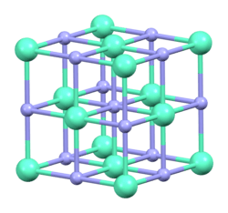 Europium(III) nitride shows Van Vleck paramagnetism[3] and crystallizes in the rock salt structure with a = 501.779(6) pm.[4][5][6] Thin films of rare earth nitrides, including europium(III) nitride, tend to form oxides in the presence of oxygen.[7] The enthalpy of formation of EuN is: ΔH0 = 217.6±25.1 kJ/mol.[8] The band gap for europium(III) nitride was calculated to be 2.08 eV.[9]