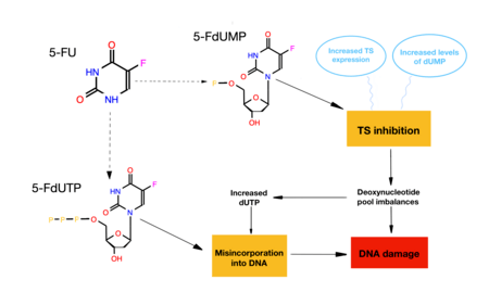 - If TS inhibition does not occur, 5- FdUMP, instead of inhibiting the enzyme, can triphosphorylate (5-FdUTP) and act as a substrate for DNA polymerase. Consequently, it is incorporated into DNA and, as it is not a natural substrate, it causes the destabilization of the molecule and the following rupture of the chain, acting as a mutagen and causing cell death.