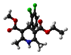 Felodipine is a member of the 1,4-dihydropyridine class of calcium channel blockers.[6]: 20–21 It is a racemic mixture, and is insoluble in water but is soluble in dichloromethane and ethanol.[6]: 25