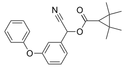 Fenpropathrin, or fenopropathrin, is a widely used pyrethroid insecticide in agriculture and household.[1][2][3][4] Fenpropathrin is an ingestion and contact synthetic pyrethroid. Its mode of action is similar to other natural (pyrethrum) and synthetic pyrethroids where in they interfere with the kinetics of voltage gated sodium channels causing paralysis and death of the pest.[5] Fenpropathrin was the first of the light-stable synthetic pyrethroids to be synthesized in 1971, but it was not commercialized until 1980.[6] Like other pyrethroids with an α-cyano group, fenpropathrin also belongs to the termed type II pyrethroids (e.g. cyfluthrin, cyhalothrin, cypermethrin, deltamethrin and esfenvalerate).[7] Type II pyrethroids are a more potent toxicant than type I in depolarizing insect nerves.[8] Application rates of fenpropathrin in agriculture according to US environmental protection agency (EPA) varies by crop but is not to exceed 0.4 lb ai/acre.