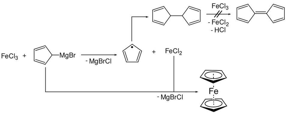The first reported syntheses of ferrocene were nearly simultaneous. Pauson and Kealy synthesised ferrocene using iron(III) chloride and cyclopentadienyl magnesium bromide.[12] A redox reaction produces iron(II) chloride. The formation of fulvalene (the intended outcome), does not occur.[9]