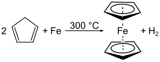 - Fe(CO)5 + 2 C5H6 → Fe(C5H5)2 + 5 CO + H2