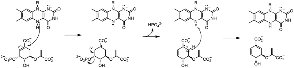 Chorismate synthase (CS) catalyzes the last step in the shikimate pathway—the formation of chorismate. Two classes of CS are known, both of which require FMN, but are divided on their need for NADPH as a reducing agent. The proposed mechanism for CS involves radical species. The radical flavin species has not been detected spectroscopically without using a substrate analogue, which suggests that it is short-lived. However, when using a fluorinated substrate, a neutral flavin semiquinone was detected.[23]
