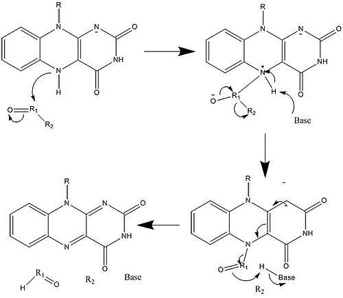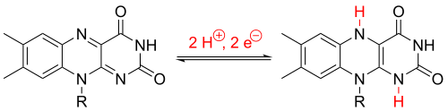 - ^ a b c Mansoorabadi SO, Thibodeaux CJ, Liu HW (Aug 2007). "The diverse roles of flavin coenzymes--nature's most versatile thespians". The Journal of Organic Chemistry. 72 (17): 6329–42. doi:10.1021/jo0703092. PMC 2519020. PMID 17580897.