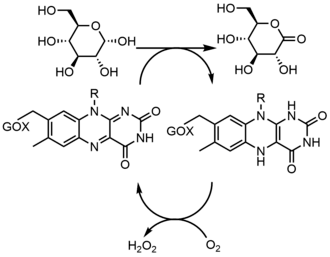 Glucose oxidase (GOX) catalyzes the oxidation of β-D-glucose to D-glucono-δ-lactone with the simultaneous reduction of enzyme-bound flavin. GOX exists as a homodimer, with each subunit binding one FAD molecule. Crystal structures show that FAD binds in a deep pocket of the enzyme near the dimer interface. Studies showed that upon replacement of FAD with 8-hydroxy-5-carba-5-deaza FAD, the stereochemistry of the reaction was determined by reacting with the re face of the flavin. During turnover, the neutral and anionic semiquinones are observed which indicates a radical mechanism.[23]