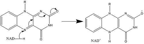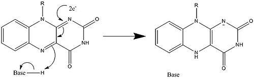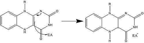 Flavoproteins utilize the unique and versatile structure of flavin moieties to catalyze difficult redox reactions. Since flavins have multiple redox states they can participate in processes that involve the transfer of either one or two electrons, hydrogen atoms, or hydronium ions. The N5 and C4a of the fully oxidized flavin ring are also susceptible to nucleophilic attack.[15] This wide variety of ionization and modification of the flavin moiety can be attributed to the isoalloxazine ring system and the ability of flavoproteins to drastically perturb the kinetic parameters of flavins upon binding, including flavin adenine dinucleotide (FAD).