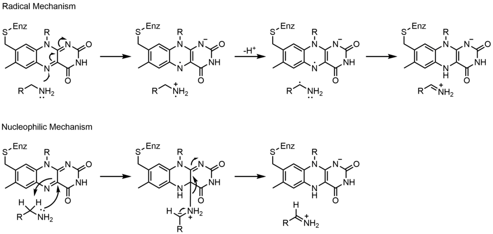 Monoamine oxidase (MAO) is an extensively studied flavoenzyme due to its biological importance with the catabolism of norepinephrine, serotonin and dopamine. MAO oxidizes primary, secondary and tertiary amines, which nonenzymatically hydrolyze from the imine to aldehyde or ketone. Even though this class of enzyme has been extensively studied, its mechanism of action is still being debated. Two mechanisms have been proposed: a radical mechanism and a nucleophilic mechanism. The radical mechanism is less generally accepted because no spectral or electron paramagnetic resonance evidence exists for the presence of a radical intermediate. The nucleophilic mechanism is more favored because it is supported by site-directed mutagenesis studies which mutated two tyrosine residues that were expected to increase the nucleophilicity of the substrates.[23]