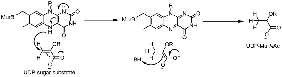 UDP-N-acetylenolpyruvylglucosamine Reductase (MurB) is an enzyme that catalyzes the NADPH-dependent reduction of enolpyruvyl-UDP-N-acetylglucosamine (substrate) to the corresponding D-lactyl compound UDP-N-acetylmuramic acid (product). MurB is a monomer and contains one FAD molecule. Before the substrate can be converted to product, NADPH must first reduce FAD. Once NADP+ dissociates, the substrate can bind and the reduced flavin can reduce the product.[23]