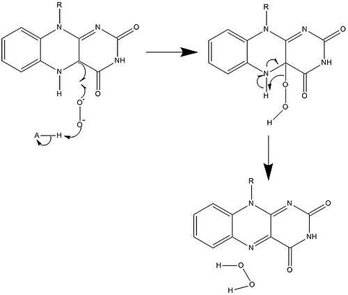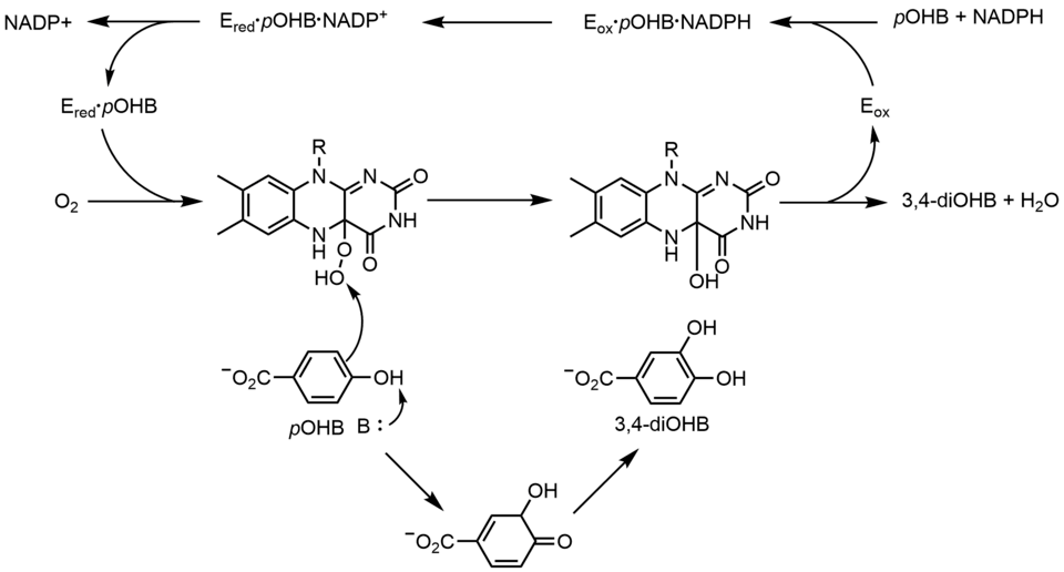 p-Hydroxybenzoate hydroxylase (PHBH) catalyzes the oxygenation of p-hydroxybenzoate (pOHB) to 3,4-dihyroxybenzoate (3,4-diOHB); FAD, NADPH and molecular oxygen are all required for this reaction. NADPH first transfers a hydride equivalent to FAD, creating FADH−, and then NADP+ dissociates from the enzyme. Reduced PHBH then reacts with molecular oxygen to form the flavin-C(4a)-hydroperoxide. The flavin hydroperoxide quickly hydroxylates pOHB, and then eliminates water to regenerate oxidized flavin.[23] An alternative flavin-mediated oxygenation mechanism involves the use of a flavin-N(5)-oxide rather than a flavin-C(4a)-(hydro)peroxide.[2][3]