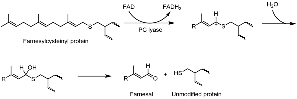 Prenylcysteine lyase (PCLase) catalyzes the cleavage of prenylcysteine (a protein modification) to form an isoprenoid aldehyde and the freed cysteine residue on the protein target. The FAD is non-covalently bound to PCLase. Not many mechanistic studies have been done looking at the reactions of the flavin, but the proposed mechanism is shown below. A hydride transfer from the C1 of the prenyl moiety to FAD is proposed, resulting in the reduction of the flavin to FADH2. COformED IS a carbocation that is stabilized by the neighboring sulfur atom. FADH2 then reacts with molecular oxygen to restore the oxidized enzyme.[23]