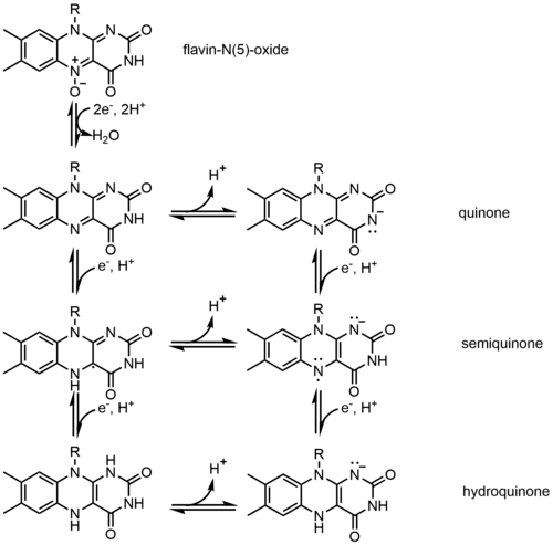 FAD exists in two common oxidation states, the fully oxidized form (FAD) and the fully reduced, dihydrogenated form, FADH2. Other oxidation states also exist, including the N-oxide and semiquinone states.[1] FAD, in its fully oxidized form, accepts two electrons and two protons to become FADH2. The semiquinone (FADH·) can be formed by either reduction of FAD or oxidation of FADH2 by accepting or donating one electron and one proton, respectively. Some proteins, however, generate and maintain a super oxidized form of the flavin cofactor, the flavin-N(5)-oxide.[2][3]