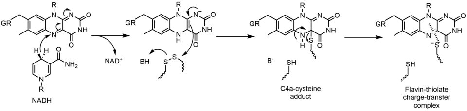 Glutathione reductase (GR) catalyzes the reduction of glutathione disulfide (GSSG) to glutathione (GSH). GR requires FAD and NADPH to facilitate this reaction; first a hydride must be transferred from NADPH to FAD. The reduced flavin can then act as a nucleophile to attack the disulfide, this forms the C4a-cysteine adduct. Elimination of this adduct results in a flavin-thiolate charge-transfer complex.[23]