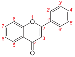 Flavone is an organic compound with the formula C6H4OC3H(Ph)O. A white solid, flavone is a derivative of chromone with a phenyl (Ph) substituent adjacent to the ether group. The compound is of little direct practical importance, but substituted derivatives, the flavones and flavonoids are a large class of nutritionally important natural products.[2] Flavone can be prepared in the laboratory by cyclization of 2-hydroxacetophenone.[3] Isomeric with flavone is isoflavone, where the phenyl group is adjacent to the ketone.
