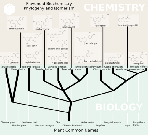 A biochemical diagram showing the class of flavonoids and their source in nature through various inter-related plant species.