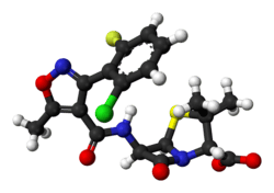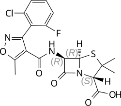 Common side effects include an upset stomach.[6] Other side effects may include muscle or joint pains, shortness of breath, and liver problems.[6][8] It appears to be safe during pregnancy and breastfeeding.[6] It should not be used in those who are allergic to penicillin.[6] It is a narrow-spectrum beta-lactam antibiotic of the penicillin class.[8] It is similar in effect to cloxacillin and dicloxacillin, being active against penicillinase forming bacteria.[9]