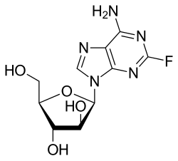 Fludarabine is a purine analogue and antineoplastic agent. It is generally used as its 5-O-phosphorylated form known as fludarabine phosphate, sold under the brand name Fludara among others. It is a chemotherapy medication used in the treatment of leukemia and lymphoma.[2] These include chronic lymphocytic leukemia, non-Hodgkin's lymphoma, acute myeloid leukemia, and acute lymphocytic leukemia.[2] It is given by injection into a vein or by mouth.[2]
