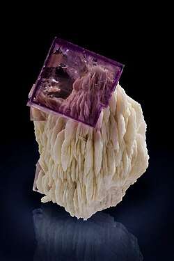 Fluorite forms as a late-crystallizing mineral in felsic igneous rocks typically through hydrothermal activity.[15] It is particularly common in granitic pegmatites. It may occur as a vein deposit formed through hydrothermal activity particularly in limestones. In such vein deposits it can be associated with galena, sphalerite, barite, quartz, and calcite. Fluorite can also be found as a constituent of sedimentary rocks either as grains or as the cementing material in sandstone.[15]