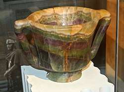 In archeology, gemmology, classical studies, and Egyptology, the Latin terms murrina and myrrhina refer to fluorite.[11] In book 37 of his Naturalis Historia, Pliny the Elder describes it as a precious stone with purple and white mottling, and noted that the Romans prized objects carved from it. It has been suggested that the Sanskrit mineral name vaikrānta (वैक्रान्तः), known from Sanskrit alchemical texts dating from the early second millennium CE onwards, may refer to fluorite.[12]