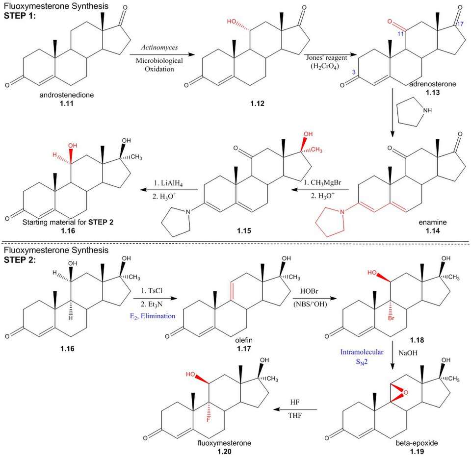 Step one: The first step in the synthesis of fluoxymesterone is the microbiological oxidation of commercially available androstenedione (1.11) by Actinomyces; this introduces a hydroxyl group to the 11α-position (1.12), which is then oxidised to a ketone using Jones' reagent, yielding the 3,11,17-triketone, adrenosterone (1.13). Pyrrolidine then reacts to form an enamine (1.14) by reaction with the 3α-keto group, protecting it from alkylation in a subsequent step. The regioselectivity of pyrrolidine for reaction at the 3α-position occurs inherently in the structure of adrenosterone, due to the position of the sterically bulky methyl groups. In subsequent steps, alkylation of the 17-keto group (1.14) using Grignard reagent, addition of hydride at the 11-position (1.15) and regeneration of the protected 3-keto group yields the starting material (1.16) for the final steps of the fluoxymesterone synthesis. This involves more standard synthetic transformations.