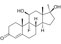 Fluoxymesterone, also known as 9α-fluoro-11β-hydroxy-17α-methyltestosterone or as 9α-fluoro-17α-methylandrost-4-en-11β,17β-diol-3-one, is a synthetic androstane steroid and a 17α-alkylated derivative of testosterone (androst-4-en-17β-ol-3-one).[25][26] It is specifically the derivative of testosterone with a fluorine atom at the C9α position, a hydroxyl group at the C11β position, and a methyl group at the C17α position.[25][26]