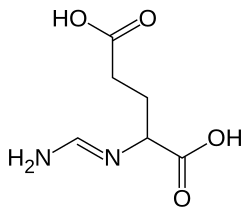 Formiminoglutamic acid (FIGLU; conjugate base, formiminoglutamate) is an intermediate in the catabolism of L-histidine to L-glutamic acid. It thus is also a biomarker for intracellular levels of folate. The FIGLU test is used to identify vitamin B12 deficiency, folate deficiency, and liver failure or liver disease.[1][2] It is elevated with folate trapping, where it is accompanied by decreased methylmalonic acid, increased folate and a decrease in homocysteine.[3]