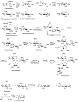 26. ^ Fan Q, Huang F, Leadlay PF, Spencer JB (September 2008). "The neomycin biosynthetic gene cluster of Streptomyces fradiae NCIMB 8233: genetic and biochemical evidence for the roles of two glycosyltransferases and a deacetylase". Organic & Biomolecular Chemistry. 6 (18): 3306–14. doi:10.1039/B808734B. PMID 18802637. S2CID 29942953.