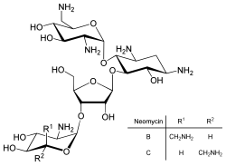 Neomycin was first isolated from the Streptomyces fradiae and Streptomyces albogriseus in 1949 (NBRC 12773).[21] Neomycin is a mixture of neomycin B (framycetin); and its epimer neomycin C, the latter component accounting for some 5–15% of the mixture. It is a basic compound that is most active with an alkaline reaction.[6] It is also thermostable and soluble in water (while insoluble in organic solvents).[6] Neomycin has good activity against Gram-positive and Gram-negative bacteria, but is ototoxic. Its use is thus restricted to the oral treatment of intestinal infections.[22]
