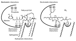 The proposed mechanism of action is depicted in figure 3. Fumonisin B1 occupies the space and electrostatic interactions of both sphinganine (or sphingosine) and fatty acyl-CoA in ceramide synthase. The part of FB1 that has structural similarity with sphingoid bases (the aminopentol part) may interact with the sphinganine binding site, whereas the negatively charged tricarbyllic acid groups may interact with the fatty acyl-CoA binding site.[8]