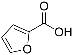 2-Furoic acid is an organic compound, consisting of a furan ring and a carboxylic acid side-group. Along with other furans, its name is derived from the Latin word furfur, meaning bran, from which these compounds were first produced.[2] The salts and esters of furoic acids are known as furoates. 2-Furoic acid is most widely encountered in food products as a preservative and a flavouring agent, where it imparts a sweet, earthy flavour.[3]