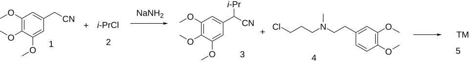 The alkylation reaction of 3,4,5-trimethoxyphenylacetonitrile (1) and isopropyl chloride (2), using sodium amide as base gives the intermediate nitrile (3). A second alkylation with a specific alkyl chloride (4) yields gallopamil.[2][3][4]