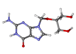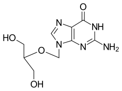 - ^ Cheng YC, Huang ES, Lin JC, Mar EC, Pagano JS, Dutschman GE, et al. (May 1983). "Unique spectrum of activity of 9-[(1,3-dihydroxy-2-propoxy)methyl]-guanine against herpesviruses in vitro and its mode of action against herpes simplex virus type 1". Proceedings of the National Academy of Sciences of the United States of America. 80 (9): 2767–2770. Bibcode:1983PNAS...80.2767C. doi:10.1073/pnas.80.9.2767. PMC 393909. PMID 6302704.