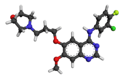 Gefitinib, sold under the brand name Iressa, is a medication used for certain breast, lung and other cancers. Gefitinib is an EGFR inhibitor, like erlotinib, which interrupts signaling through the epidermal growth factor receptor (EGFR) in target cells. Therefore, it is only effective in cancers with mutated and overactive EGFR, but resistances to gefitinib can arise through other mutations. It is marketed by AstraZeneca and Teva.