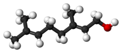 In addition to being found in rose oil, palmarosa oil, and citronella oil, it also occurs in small quantities in geranium, lemon, and many other essential oils. With a rose-like scent,[6] it is commonly used in perfumes and in scents such as peach, raspberry, grapefruit, red apple, plum, lime, orange, lemon, watermelon, pineapple, and blueberry.