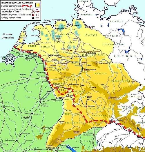 In the late 1st century BC, the Roman emperor Augustus launched campaigns across the Rhine, and incorporated areas of Germania as far east as the Elbe into the Roman Empire, creating the short-lived Roman province of Germania Antiqua in 7 BC, with further aims of establishing a greater province of Magna Germania, with headquarters at Colonia (modern-day Cologne). The Roman campaign was severely hampered by the victory of Arminius at the Battle of the Teutoburg Forest in AD 9.[12] The outcome of this battle dissuaded the Romans from their ambition of conquering Germania, and is thus considered one of the most important events in European history.[24] The Rhine eventually became the border between the Roman Empire and Magna Germania. Areas of northeast Gaul bordering the Rhine remained under Roman control, and are often referred to as "Roman Germania". Four Roman legions were stationed there, and a Roman fleet, the Classis Germanica, was also established. The area was effectively governed as Roman provinces.[12]