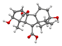 Plants in their normal state produce large amounts of GA3. It is possible to produce the hormone industrially using microorganisms.[2] Gibberellic acid is a simple gibberellin, a pentacyclic diterpene acid promoting growth and elongation of cells. It affects decomposition of plants and helps plants grow if used in small amounts, but eventually plants develop tolerance to it. GA stimulates the cells of germinating seeds to produce mRNA molecules that code for hydrolytic enzymes. Gibberellic acid is a very potent hormone whose natural occurrence in plants controls their development. Since GA regulates growth, applications of very low concentrations can have a profound effect while too much will have the opposite effect.[3] It is usually used in concentrations between 0.01 and 10 mg/L.