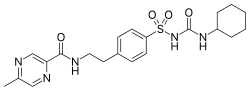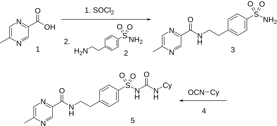 5-Methylpyrazine-2-carboxylic acid [5521-55-1] (1) is converted to its acid chloride. A Schotten-Baumann reaction is then performed with 4-(2-aminoethyl)benzene sulfonamide [35303-76-5] (2) to give the corresponding amide PC9883549 [33288-71-0] (3). This forms glipizide on reaction with cyclohexylisocyanide and base in acetone.