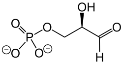 Glyceraldehyde 3-phosphate, also known as triose phosphate or 3-phosphoglyceraldehyde and abbreviated as G3P, GA3P, GADP, GAP, TP, GALP or PGAL, is a metabolite that occurs as an intermediate in several central pathways of all organisms.[2][3] With the chemical formula H(O)CCH(OH)CH2OPO32-, this anion is a monophosphate ester of glyceraldehyde.